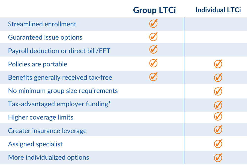 Providing long-term care insurance as a group benefit is a cost-effective way to help employees plan for their future. As an employer, you can offer long-term care insurance to your employees as a voluntary benefit, allowing them to choose to enroll in the plan and pay the premiums themselves. Some employers contribute to the cost of the premiums as part of their benefits package.